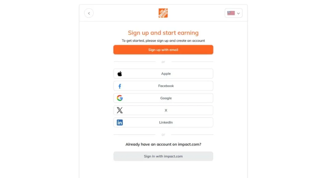 • Register on Impact Radius: Visiting the affiliate page of the Home Depot, you have to press the application button and you will be directed to the Impact Radius. There, either create a new account, or log in to an existing one.