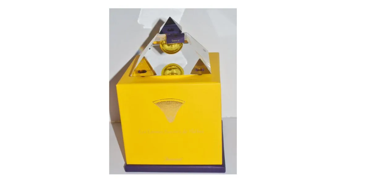 This perfume is named in English as The Sacred Tears of Thebes, and was inspired by the ancient Egyptian ritual and mysticism. Key details: Scent composed of myrrh and frankincense — two of the most sacred substances in human history. Hand-blown crystal bottle in the shape of a pyramid. Thick amethyst cap. Only three bottles were ever made
